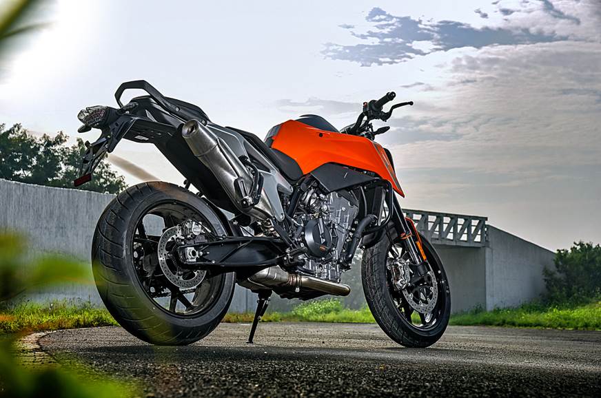 The 790 also stands out, being the first-ever KTM to use a parallel-twin motor – another decision taken for size and packaging advantages, as well as price advantages over V-twin motors. Parallel twins also have the advantage of being cheaper to both produce and maintain. This 8-valve DOHC motor displaces 799cc and runs a high compression ratio of 12.7:1 which helps it put out 105hp and 87Nm of torque. The bike's power figure is the lowest in its segment, but the torque figure is almost class-leading and that’s what defines the riding experience.
