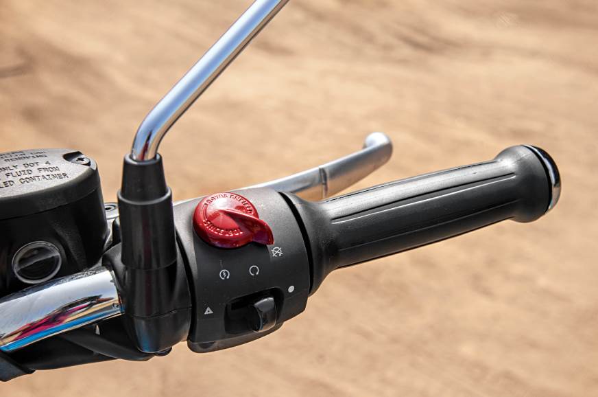 With an analogue speedo on the outer circumference and a digital display below, the unit tells you important things like how much fuel is left, what time it is and what gear you’re in, and it has two trip meters. That’s what you see on the large dial on the left, but the small dial on the right is a colour display for Royal Enfield’s new Tripper navigation system. Using Google Maps data, this system works when connected to the Royal Enfield app, and we found it to be quite intuitive and helpful. On the downside, it doesn’t give you any telephony related notifications because Royal Enfield says it wants this to be a distraction-free experience. If you decide not to use the Tripper Navigation, this display will simply show you the time.